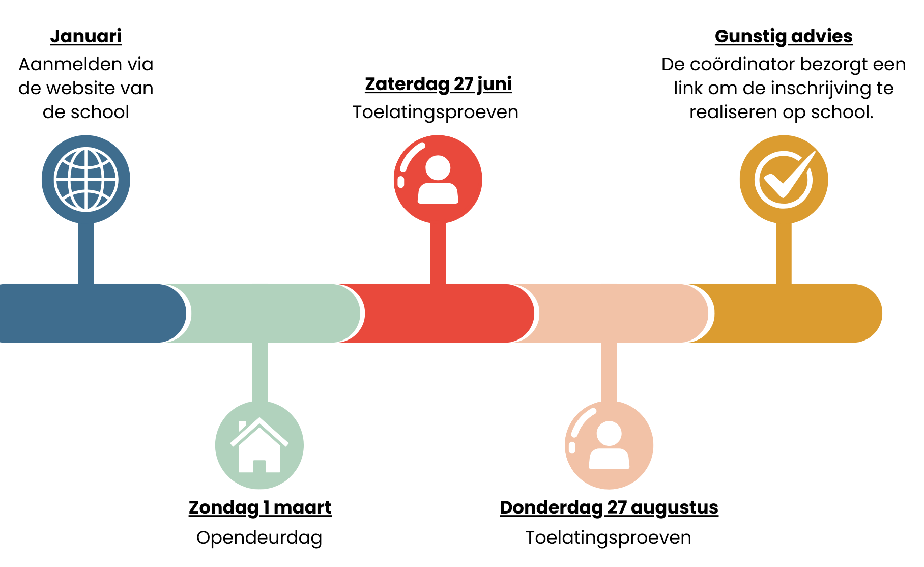 Vanaf januari kunnen leerlingen zich aanmelden voor de toelatingsproeven via de formulieren op onze website. Voor elke richting is een toelatingsproef verplicht. Na de aanmelding ontvang je een bevestiging en neemt de coördinator contact met je op voor verdere praktische info.